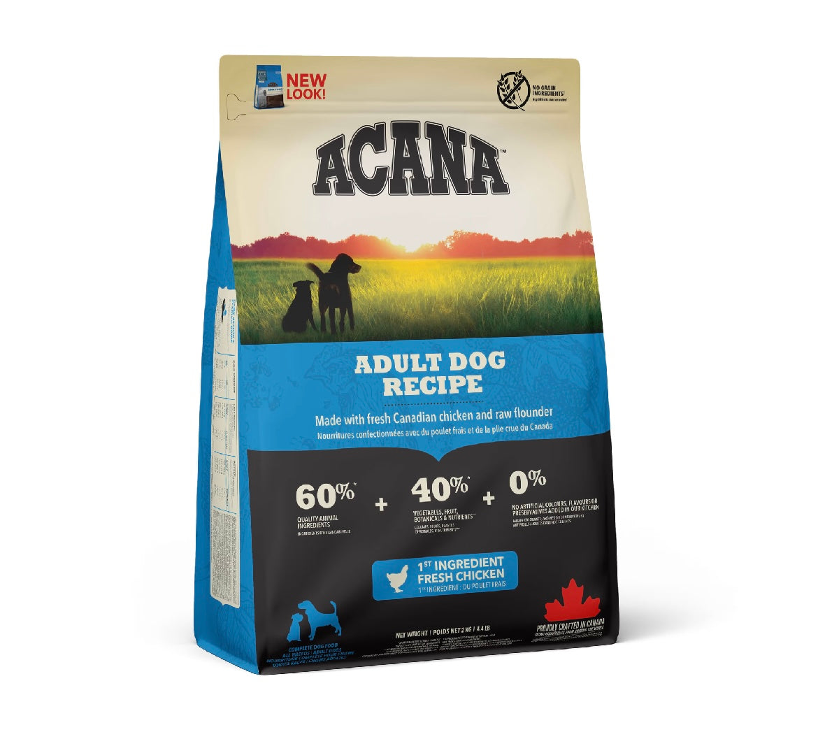 アカナのドッグフードは、全ての原材料にこだわり最高品質のものを使用。「アカナ アダルトドッグレシピ」は、小型犬から大型犬まで全ての犬種の成犬のために、原材料調達から調理まで考え抜いて作られています。カナダ産の新鮮な鶏肉や生のヘイクなどの高品質な動物原材料を60%、フルーツや野菜、ハーブを40%とバランスよく配合したこのドッグフードは、小型犬から大型犬まで全ての犬種の成犬の健康をサポートします。