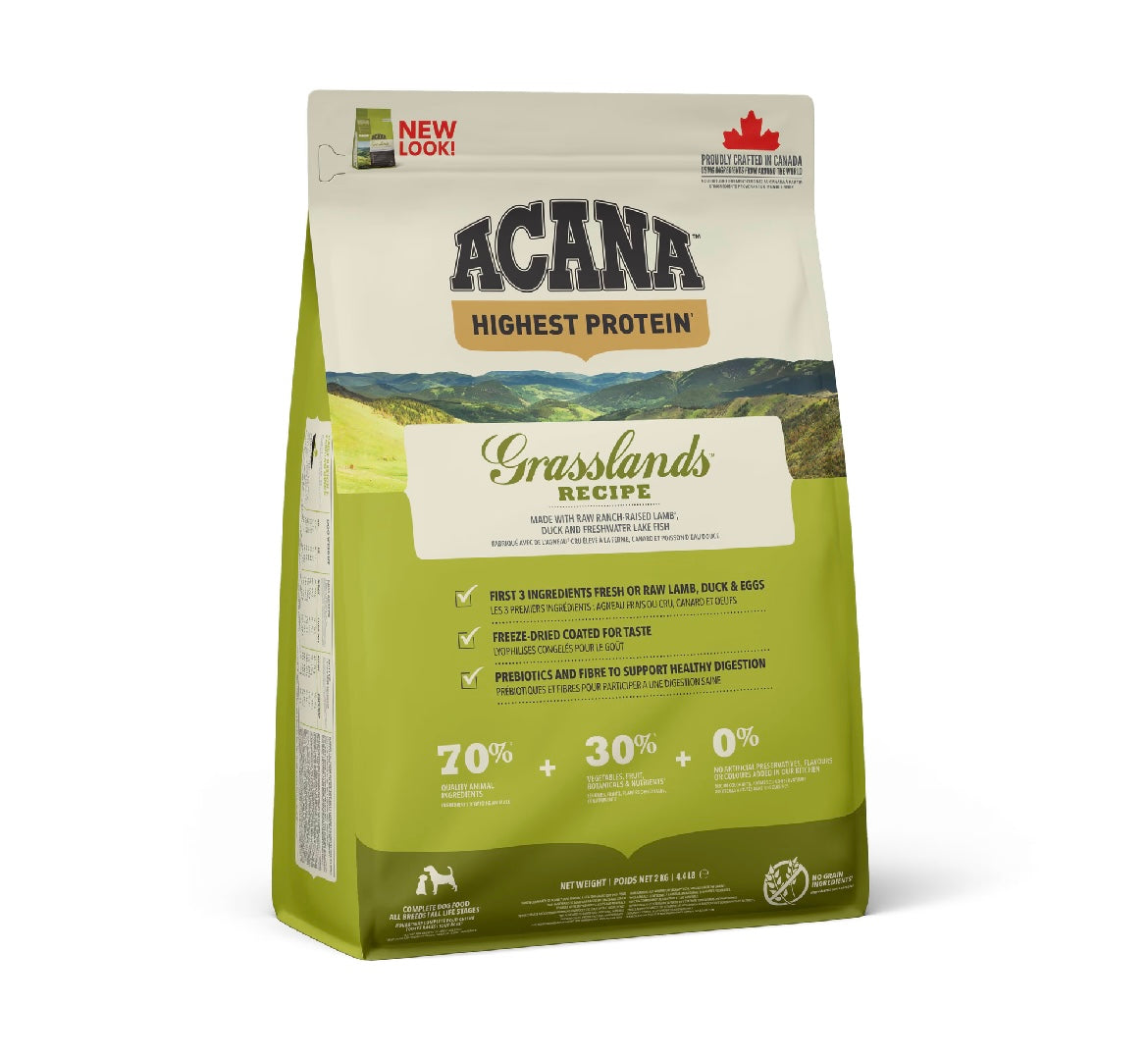 アカナのドッグフードは、全ての原材料にこだわり最高品質のものを使用。「アカナ ハイエストプロテイン グラスランドドッグレシピ」はアカナのラインナップの中でも特に高タンパク質な、羊肉を中心とした動物原材料を使ったドッグフードです。牧場でのびのびと飼育された子羊や鴨、卵、淡水魚などの高品質な動物原材料を70%、毎日キッチンに届けられる新鮮なフルーツや野菜、ハーブを30%の比率で配合しています。人工着色料、人工香料、人工保存料無添加で、ペットにとって自然な食事を再現しました。お腹が弱い子にオススメです。