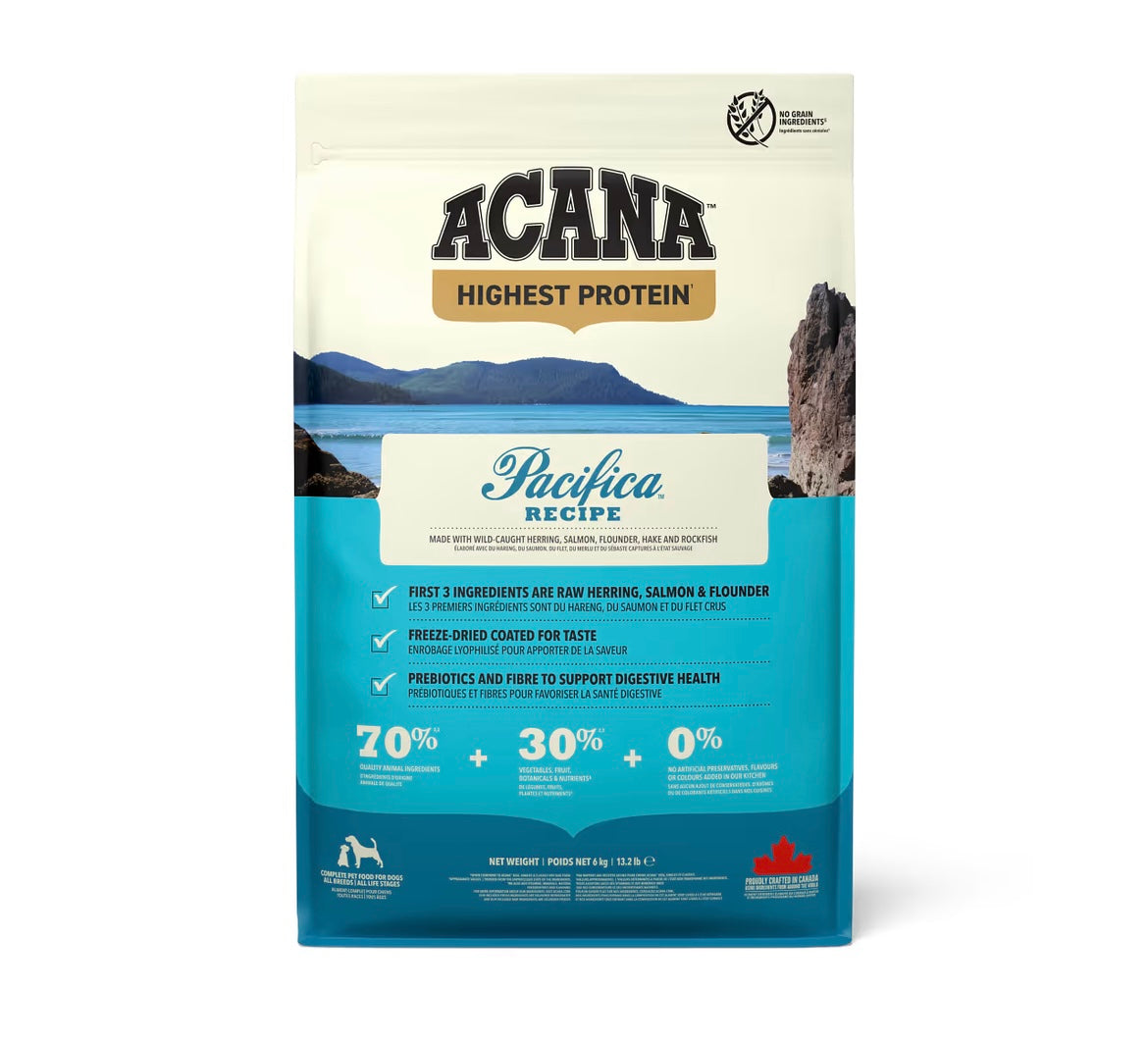 アカナのドッグフードは、全ての原材料にこだわり最高品質のものを使用。「アカナ ハイエストプロテイン パシフィカドッグレシピ」はアカナのラインナップの中でも特に高タンパク質な、魚のみの動物原材料を使ったドッグフードです。丸ごとのサーモンやニシン、メバル、ヘイク、カレイなどの高品質な動物原材料を70%、毎日キッチンに届けられる新鮮なフルーツや野菜、ハーブを30%の比率で配合しています。人工着色料、人工香料、人工保存料無添加で、ペットにとって自然な食事を再現しました。オメガ3が多く皮膚・被毛の健康を気にされている子のオススメです。