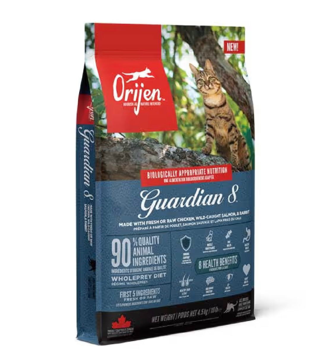 「オリジン ガーディアン8」は、猫によく見られる8つの悩みに対応するために特別に作られた、栄養価の高いキャットフードです。8つの悩みとは、免疫機能、消化器系、皮膚・被毛、筋肉維持、心臓、関節、脳・認知機能、目といった、それぞれの健康にまつわる問題のこと。フードには新鮮または生の丸ごとの動物性原材料を全体の90%使用し、添加栄養素を最低限に抑えました。フードに使用する原材料の3分の2は新鮮、または生のものにこだわっています。愛猫の健康維持に「オリジン ガーディアン8」が大きく役立つことでしょう。