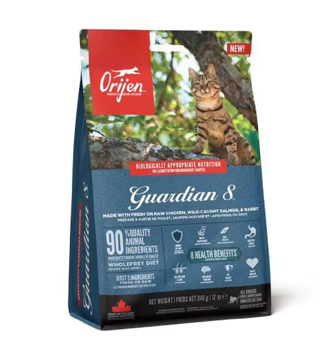 「オリジン ガーディアン8」は、猫によく見られる8つの悩みに対応するために特別に作られた、栄養価の高いキャットフードです。8つの悩みとは、免疫機能、消化器系、皮膚・被毛、筋肉維持、心臓、関節、脳・認知機能、目といった、それぞれの健康にまつわる問題のこと。フードには新鮮または生の丸ごとの動物性原材料を全体の90%使用し、添加栄養素を最低限に抑えました。フードに使用する原材料の3分の2は新鮮、または生のものにこだわっています。愛猫の健康維持に「オリジン ガーディアン8」が大きく役立つことでしょう。