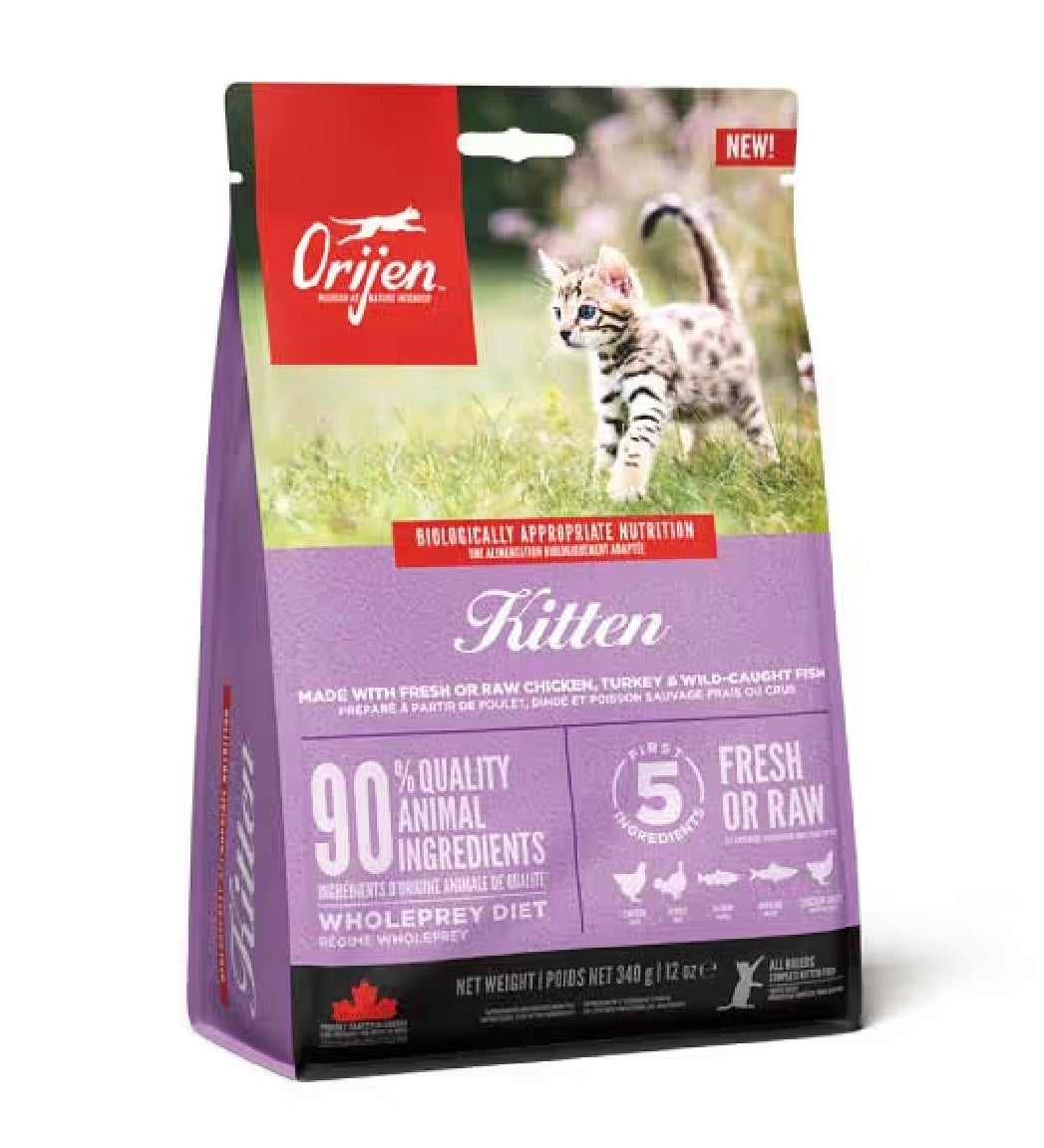 「オリジン キトゥン」は、子猫が健康で丈夫に成長するために特別に作られたキャットフード。鶏肉や七面鳥、サーモン、サバ、ニシン、ポロック油など、高品質な動物性原材料を全体の90%使用し、素材の中でも特に栄養のある肉や内臓、骨などを余すところなく配合。新鮮または生の原材料が15種類も含まれています。また、魚に含まれるDHAとEPAは、子猫の脳の発達や認知機能をサポートします。子猫の成長に欠かせない高品質な動物性タンパク質がたっぷり含まれた「キトゥン」は、お客様の愛猫が元気に成長する手助けをします。