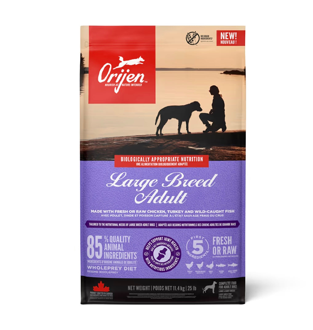 犬は祖先とされるハイイロオオカミのように、栄養豊富でさまざまな種類の動物原材料を丸ごと食べられるような身体構造をしていると言われています。 「オリジン ラージブリードアダルト」は放し飼いで健康的に育った鶏や七面鳥、天然魚、平飼い卵など高品質な動物性原材料を使用した、大型犬成犬向けのドッグフードです。原材料の3分の2は新鮮または生のもので、新鮮な食材をオリジン自社キッチンで丁寧に調理することで、鮮度が良く栄養たっぷりのドッグフードができ上がります。「オリジン ラージブリードアダルト」は大型犬成犬の関節の健康維持をサポートします。