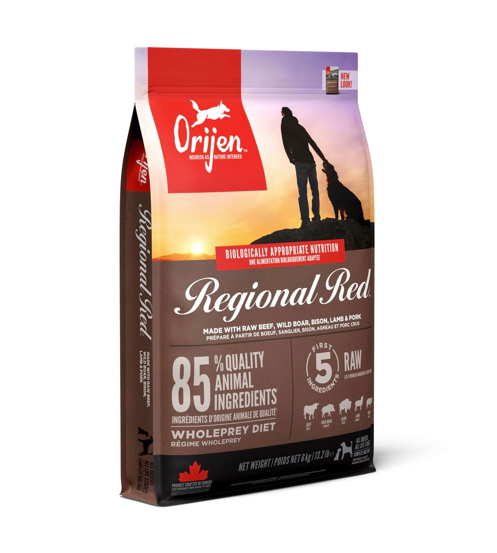 野生で暮らしていた犬の祖先は、肉や内臓、軟骨、骨など、狩りで得た獲物を丸ごと食べていたと言われています。そうすることで最適な健康状態を保つために必要な栄養を自然に摂取していたのです。「オリジン レジオナルレッド」は、牧場飼育の牛肉、牧草飼育の子羊、生豚肉などの動物原材料を丸ごと使用。野生動物が獲物を捕食して摂取する本来の栄養素を食材で再現しました。動物性タンパク質をたっぷり含んだ「オリジン レジオナルレッド」は自然本来の栄養を求める愛犬にとって理想的なドッグフードです。