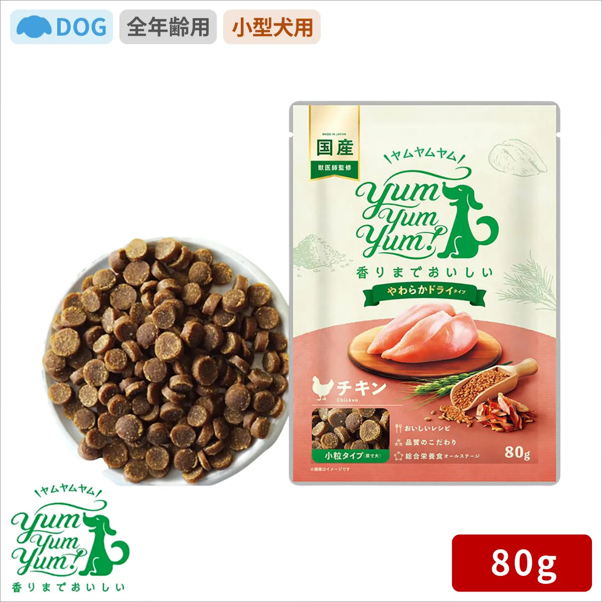 しっとりソフトな食感が大人気のyum yum yum! やわらかドライがさらにおいしくなって新登場。国産の若鶏生肉やカツオ節などを加えた香り高いフードを、おいしさを逃さないようにパック詰めしてレトルト加工し、しっとりソフトな食感に仕上げました。保湿剤や保存料は不使用。カツオ節を増量し、鶏がらスープを追加することでさらにお出汁のようなおいしい香りが広がります。特に偏食気味の小型犬におすすめです。