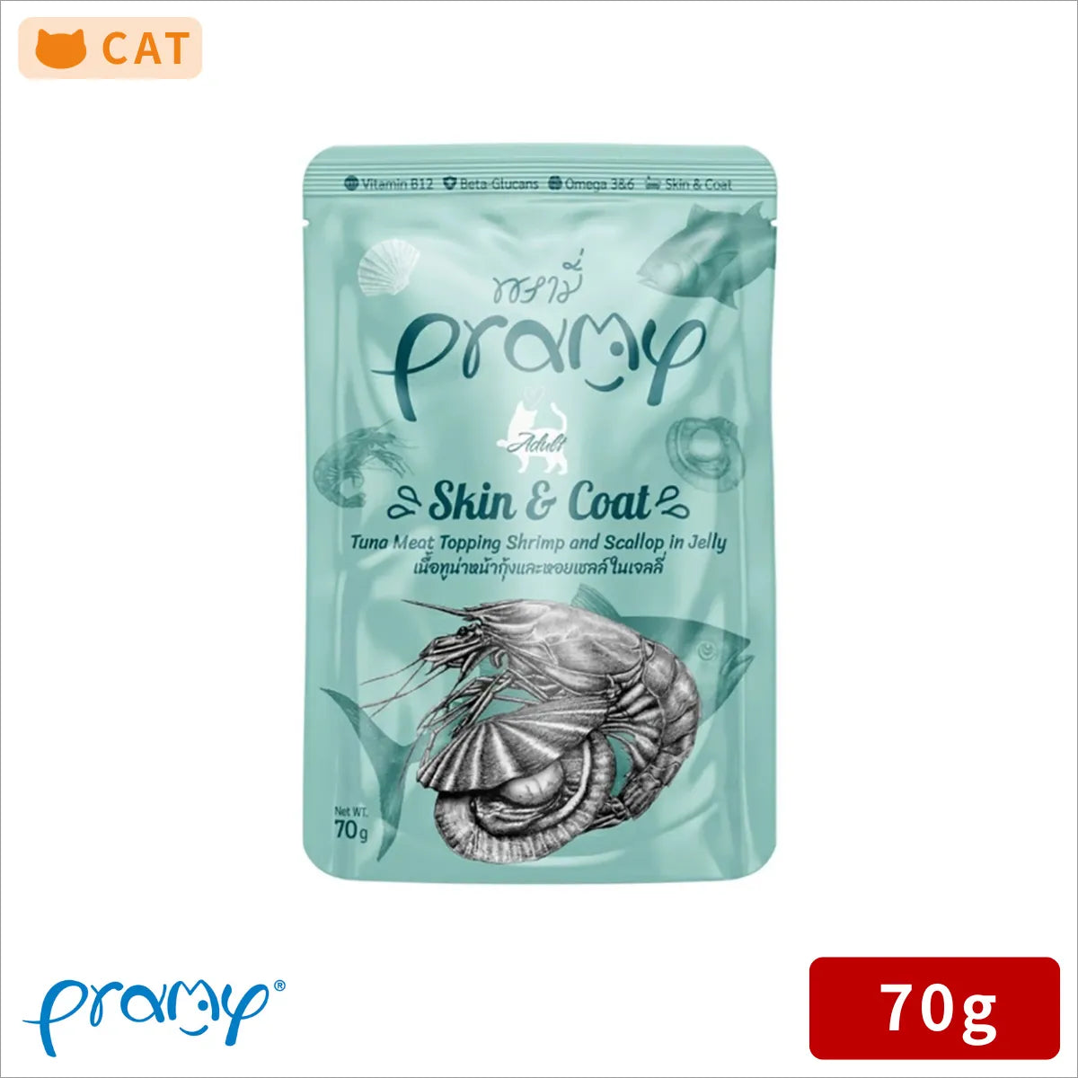 プラミーは、美味しさと栄養にこだわった愛猫用のキャットフードです。プラミー ツナ・エビ・ホタテゼリー スキン&コート 70g 正規品 Pramy キャットフード ペットフード ウェットフード 猫用