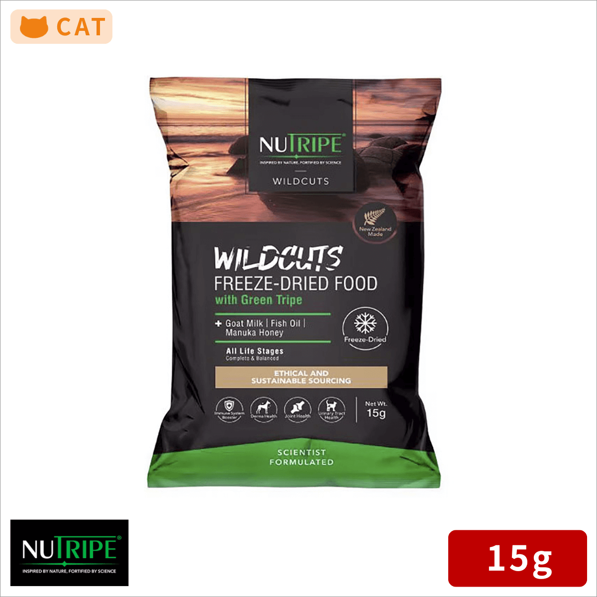 「フィッシュ&ラムwithグリーントライプ」は、オメガ3脂肪酸が豊富で、健康な肌、光沢のある被毛、健康な関節をサポートします。 ニュートライプ ドライフード キャット ワイルドカット フリーズドライ フィッシュ&ラムwithグリーントライプ 15g 正規品 キャットフード 総合栄養食