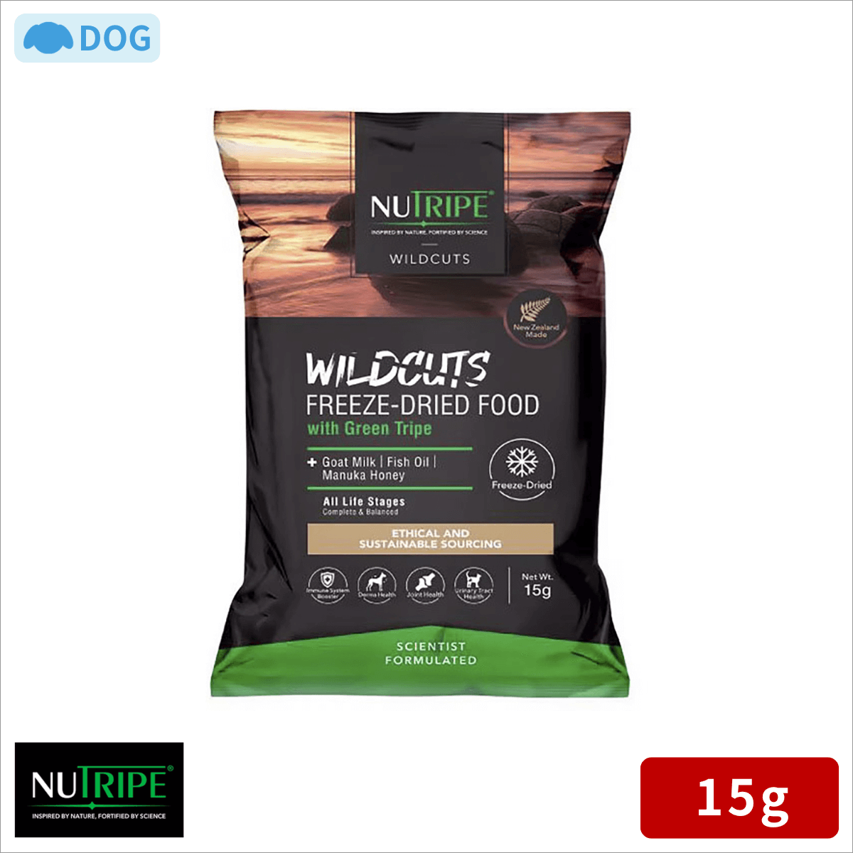「ビーフwithグリーントライプ」は、ニュージーランドの牧草地で放牧されている牛の肉で構成される動物性タンパク質源のブレンドです。 ニュートライプ ニュートライプ ワイルドカット フリーズドライ ビーフwithグリーントライプ 15g 正規品 グレインフリー ドッグフード