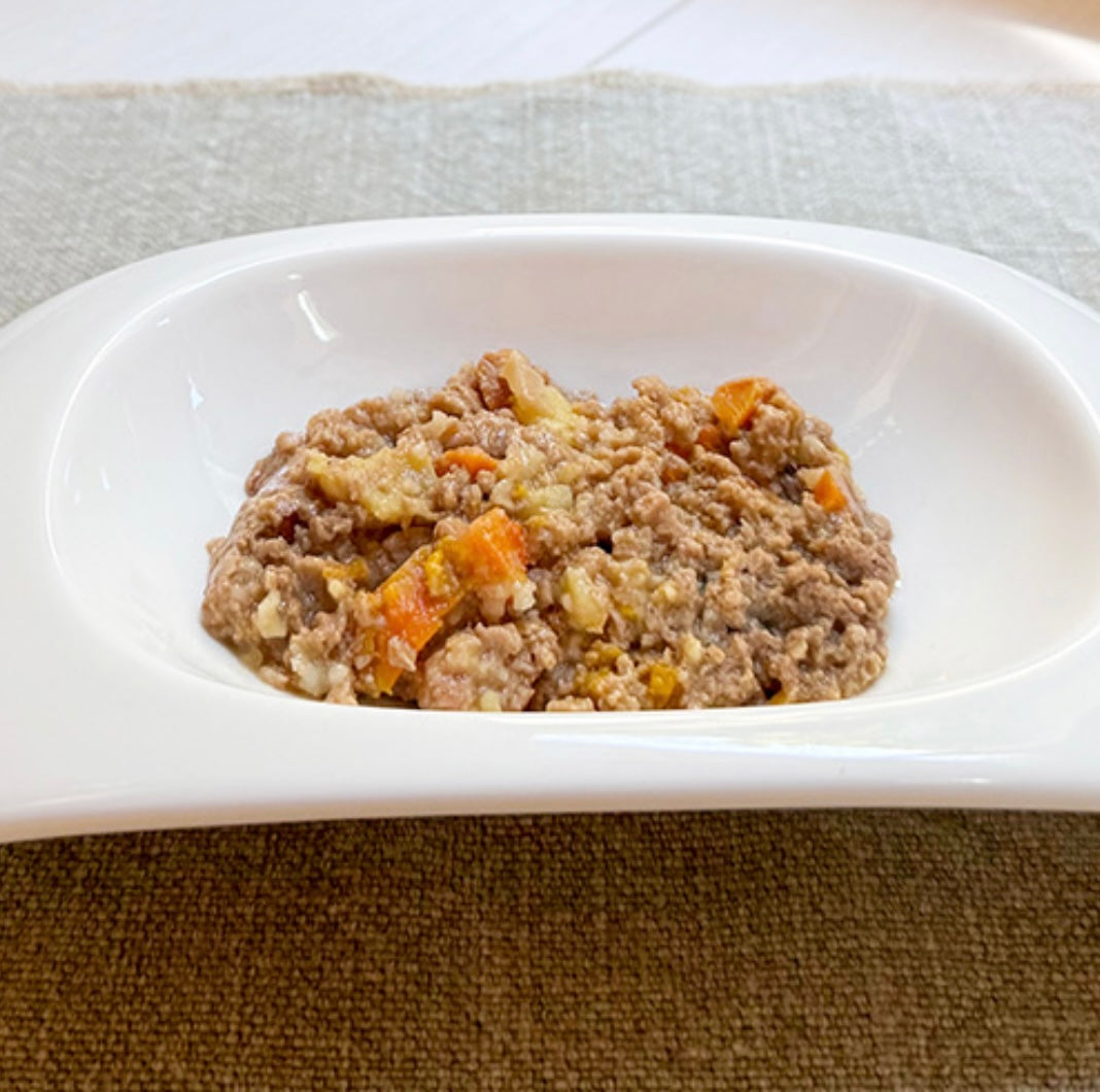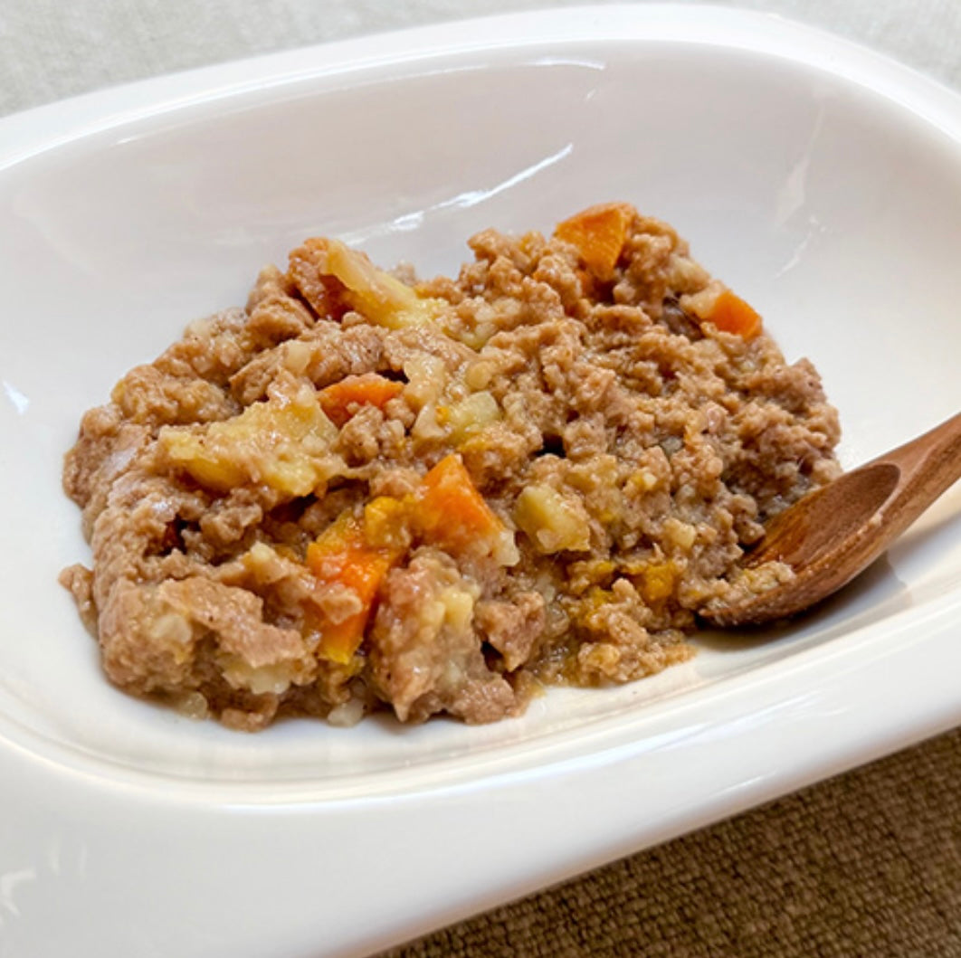 鶏肉,にんじん,さつまいも,かぼちゃ,ブロッコリー,白米,米油,酵母エキス,てんさい繊維,カツオ節,卵黄パウダー,カツオ節エキス,オオバコ種皮パウダー,帆立出汁,ビール酵母,しいたけ,DHA含有精製魚油,発酵調味液,フラクトオリゴ糖,豚軟骨抽出物(コンドロイチン硫酸含有),昆布,乳酸菌,乳酸菌抽出物,デキストリン,セレン酵母,マリーゴールド(ルテイン含有),グルコサミン,ミネラル類(貝殻カルシウム,グルコン酸亜鉛,ピロリン酸第二鉄,グルコン酸銅),ビタミン類(ビタミンA,ビタミンD,ビタミンE,ビタミンB1,ビタミンB2,ビタミンB12,パントテン酸カルシウム)